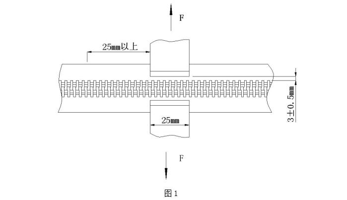 8.2.2、測試步驟取長(cháng)度大于 75mm 的拉鏈樣本一段,裝夾在上述夾具中,裝夾時(shí)應將鏈牙腳和夾具的夾口部位對齊緊靠(如圖 1)。啟動(dòng)材料試驗機,測試至脫牙或者布帶破損為止,此時(shí)顯示的最大數值即為碼裝的平拉強力值,采取多次測試取有效范圍值。