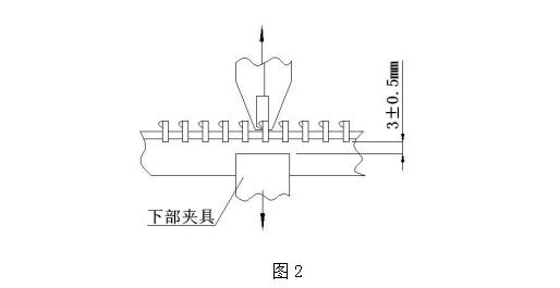 9.2.2、測試步驟 取長(cháng)度大于 50mm 的拉鏈單邊鏈帶樣本一段,裝夾在上述夾具中,裝夾時(shí)應將鏈牙腳和夾具的夾口部位對齊緊靠(如圖 2)。用單牙拉脫加緊鉗夾住一顆鏈牙,啟動(dòng)測試儀,測試至脫牙為止,此時(shí)顯示的最大數值即為單牙結合強力值,采取多次測試取有效范圍值。