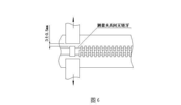 取長(cháng)度大于 50mm 的閉尾拉鏈樣本一段,將下止以上的咪牙去除掉 3~4 粒后裝夾在上述夾具中, 裝夾時(shí)應將下止對準夾具的中間部位,下止和夾具的夾口部位對齊緊靠(如圖 6)。啟動(dòng)測試儀,測試至下止變形松動(dòng)、脫落或者布帶破損為止,此時(shí)顯示的最大數值即為碼裝的平拉強力值,采取多次測試取有效范圍值。