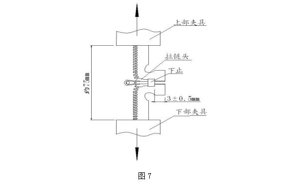取長(cháng)度約 50mm 帶拉頭(自鎖頭應先排除自鎖功能)及下止的拉鏈樣本一段,將拉頭拉至下止(拉片翻起),兩帶筋分別裝夾于上下夾具間(先去掉一段約 10mm 的鏈牙),夾具距離約 75mm(如圖 7)。啟動(dòng)測試儀,測試至拉鏈破損為止,此時(shí)的強力值即為下止強力,采用多次測試取有效范圍值。