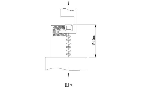 9.2.1.2、測試夾具主要尺寸:下部夾具寬 25mm,夾緊面齒形夾角 60°,節距 1.5mm,齒頂寬 0.2mm, 嚙合夾緊口到內齒 3mm 處加工成低于齒面 0.5mm 的平面;上夾具為鉗口,端部折彎 90°,嚙合口后空余約 5mm 滿(mǎn)足鏈牙點(diǎn)高要求。